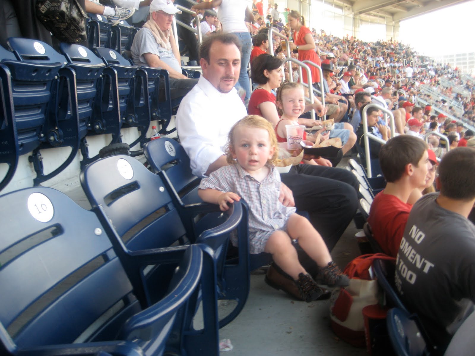 A couple of weeks ago we went to a Nationals game with a 4:35 first pitch. Even though it was 98 degrees, it was perfect. One section of the stands is in shade in the afternoon, it also happened to be $1 kids ticket night (under 2 years old is free, but otherwise kids pay adult prices), there are plenty of concessions, and Strasburg was pitching (and despite getting the L, he had 10 strikeouts and set the record for most Ks in 4 games for a rookie).